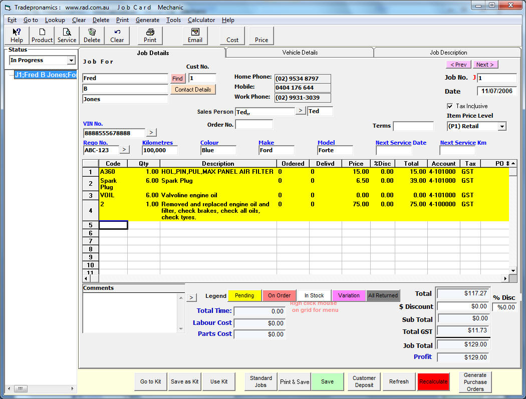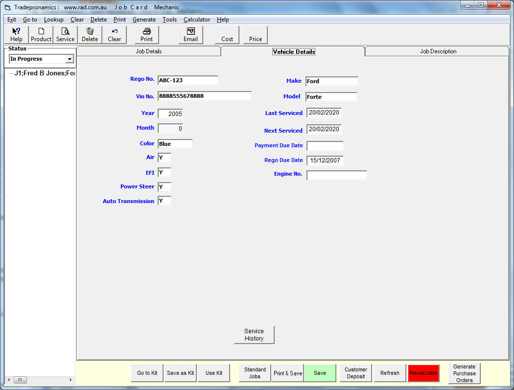 Book a Vehicle, select a standard service such as a 30,000km or attach any parts and labour required to the booking. When the customer comes in click one button on the booking and a job card is generated. Print the job card with the legals on it and get the customer to sign it, When the customer comes in to pay for the service, click one button on the job card and an invoice is generated. |