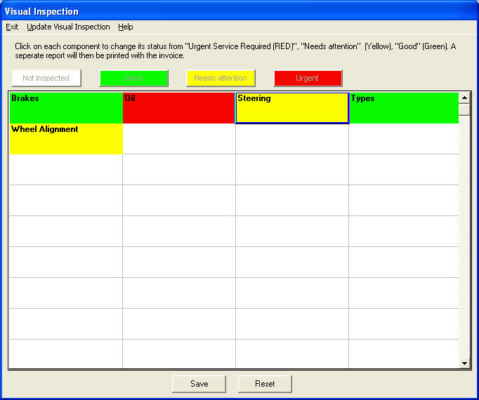 | While you are invoicing a customer, this screen allows you to print an additional page at the end of the invoice to inform your customer of other components that you have visually inspected. This brings extra work for you. As you click on the component, the color changes from Red, Yellow and Green (like the traffic lights). Red meaning “urgent attention” is need, yellow meaning “needs attention” and green meaning “good”. |